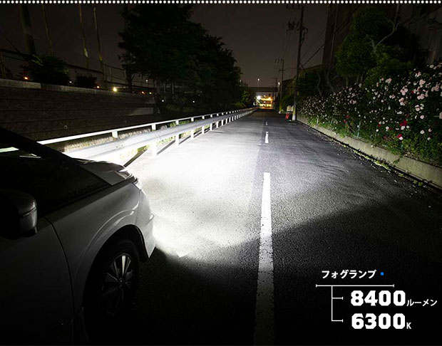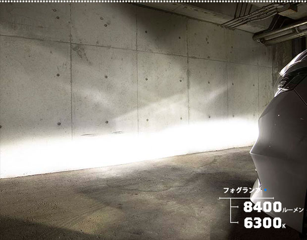 55W ハロゲンランプの明るさ2200Lm(※1)を超える十分な光量です。 全光束8400ルーメン(※2)、最強のモンスター級フォグランプ用LEDバルブキットです。