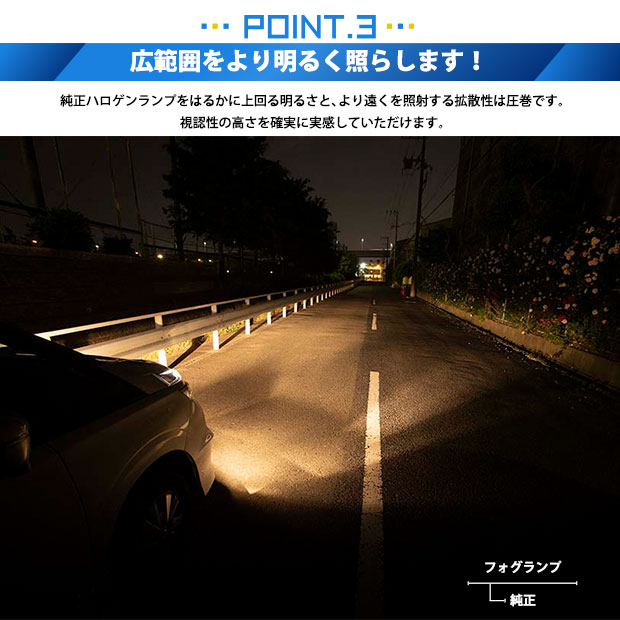 純正ハロゲンバルブを遥かに上回る明るさと、より遠くを照射する拡散性は圧巻です。視認性の高さを確実に実感していただけます。