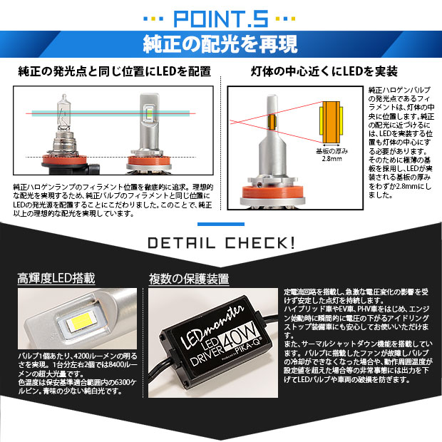 リフレクター性能を最大限効果的に引き出すような設計で純正球の発光位置と同じ位置、灯体の中心にLEDを実装。純正ハロゲンバルブ近似のカットラインを再現しています。