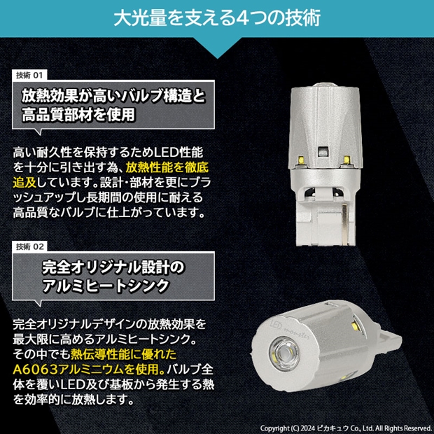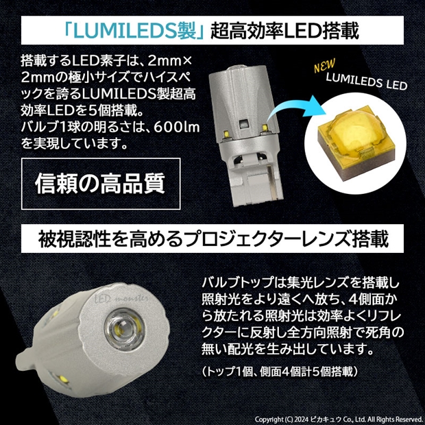 バルブ装着時のステルス性を高めるため高出力で蛍光体が極力小さいLEDを選択。クリアレンズ車両への装着時にLED素子の映り込みを最小限に抑えることが出来ます。