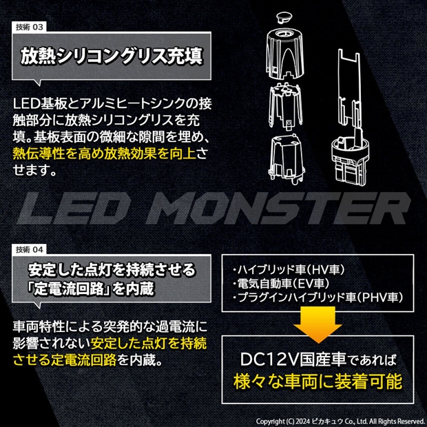 車両特性による突発的な過電流に影響されない安定した点灯を持続させる定電流回路を内蔵。DC12V国産車であればHV、PHV、EV等様々な車両に装着可能です。