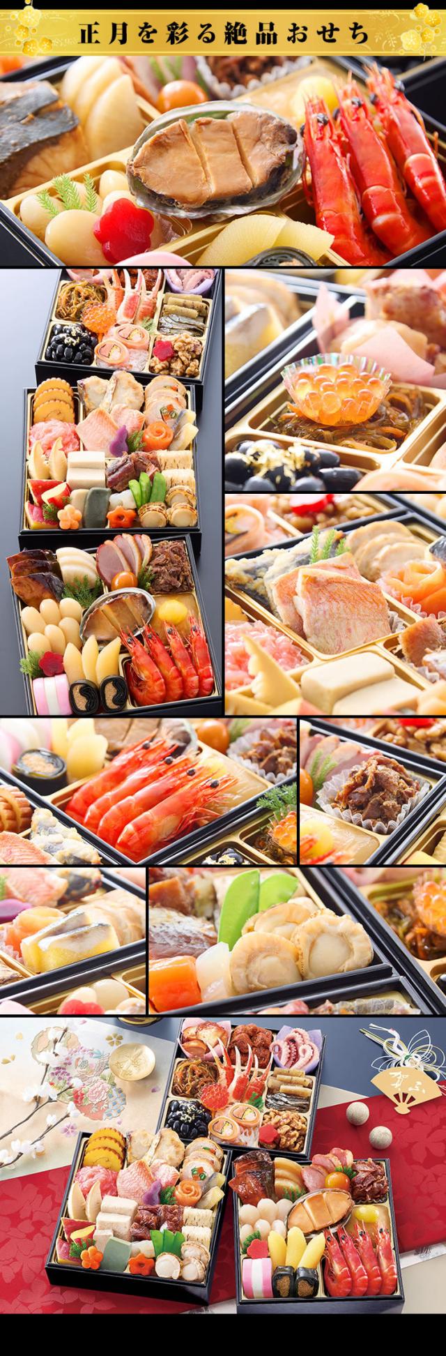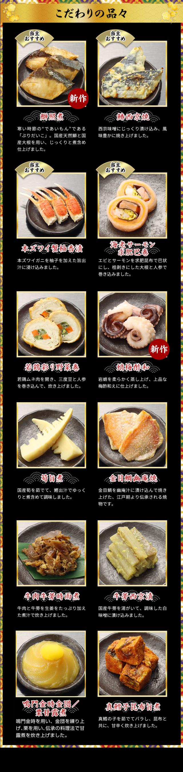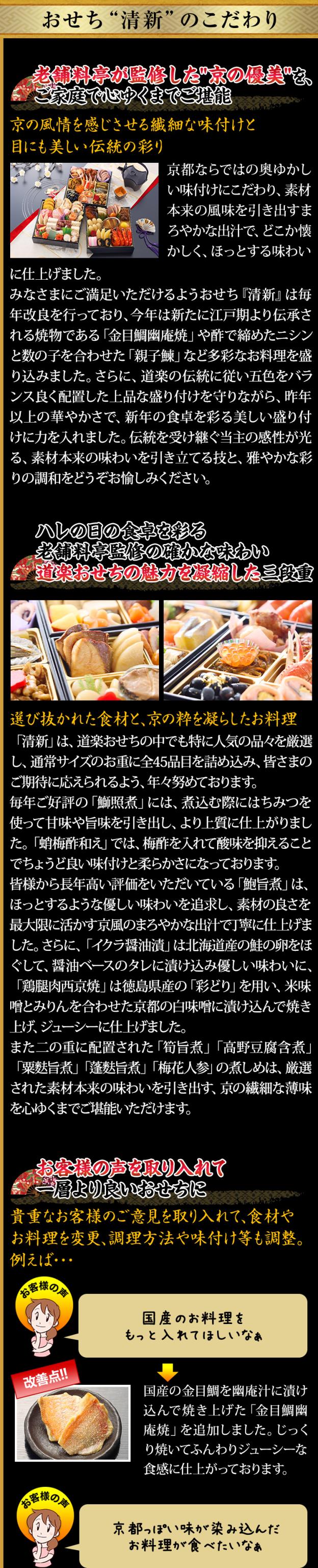伝統ある京料理をお気軽に堪能できる和のおせちとして、長年ご好評をいただいております「清新」は、試行錯誤を繰り返し行っています。初めてお召し上がる方はもちろん、昨年お召し上がりいただいた方にも、ご満足いただけるよう、今年も内容を見直し改良を重ねました。今年は「金目鯛幽庵焼」や「親子鰊」など新たな食材を取り入れ、またご好評頂いている豪華食材である優しい味わいの「海老旨煮」やふっくらと炊き上げた「鮑旨煮」はそのままに。素材の味を活かした職人の技と、美しい彩りを目と舌でお楽しみください。