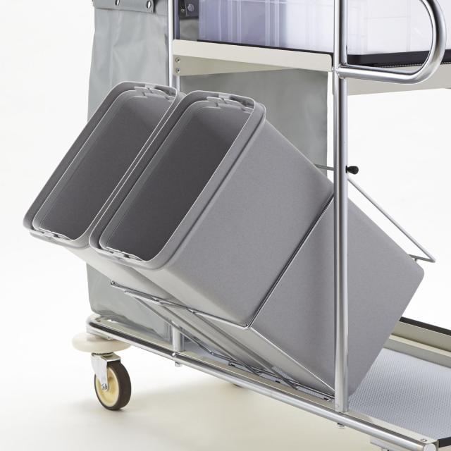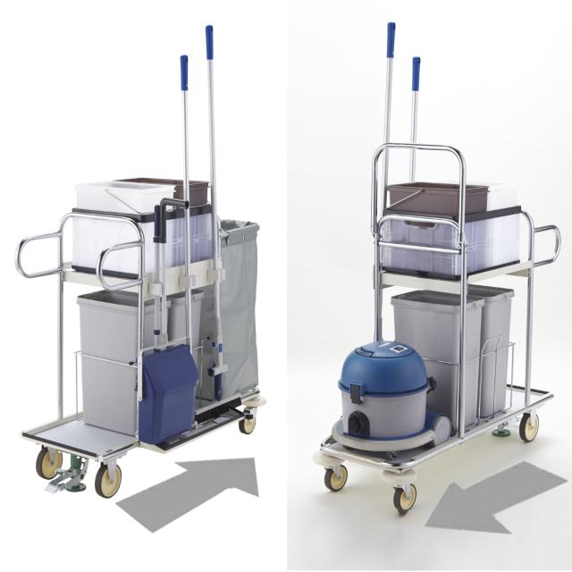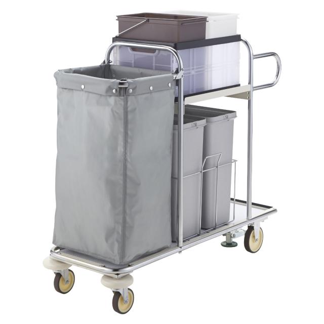 大型の商業・公共施設に適している小型で軽量な清掃用カートです。コンテナが傾けられるので、収納物の出し入れがスムーズになり、効率よく作業が行えます。
