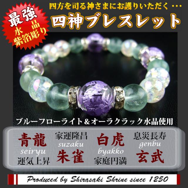 風水四神獣 フローライト パワーストーンブレスレット 神社でお清め・お祓い済み 内周17cm/高級桐箱付き/守護石/お守り/祈願済み