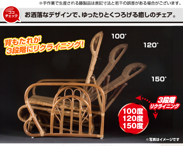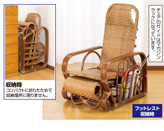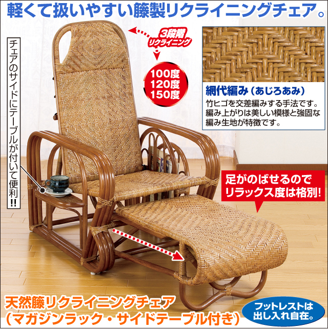 リクライニングチェア フットレスト付き ラタンチェア マガジンラック サイドテーブル付き 座椅子 折りたたみ 収納 天然籐 リゾート風 送料無料
