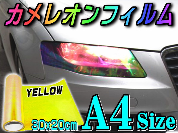 カメレオンフィルム (A4) 黄 幅30cm×20cm A4サイズ イエロー カラーフィルム レンズフィルム スモーク テール ランプ 貼り方 保護 プラズマ マジョーラ レインボー ライト クリスタル クリア プロテクションフィルム シート ヘッドライトフィルム