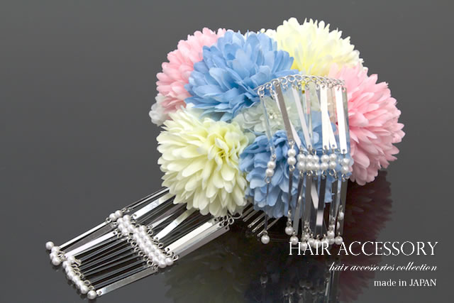 色とりどりのダリアを束ねた、ふわりとした髪飾りです。