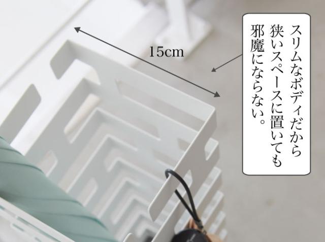 風を通しやすいフレーム構造で濡れた傘も乾きやすく、奥行き15cmのスリムなボディで狭いスペースに置いても邪魔になりません。