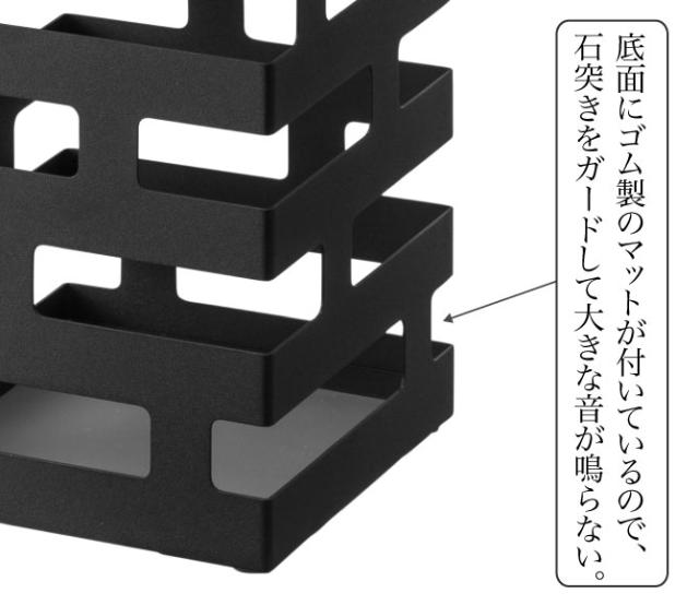 底面には受け皿とゴム製のマットが付いているので、ラフに傘を入れても石突きをガードし大きな音が鳴ったり、傘の破損を軽減。
