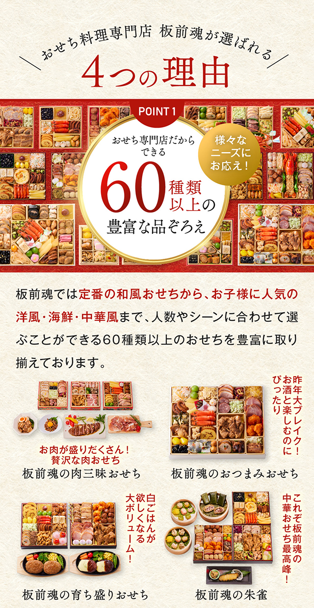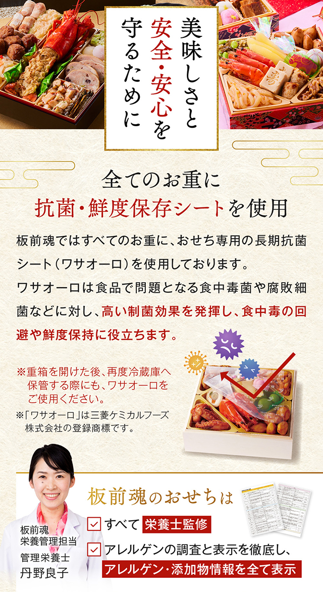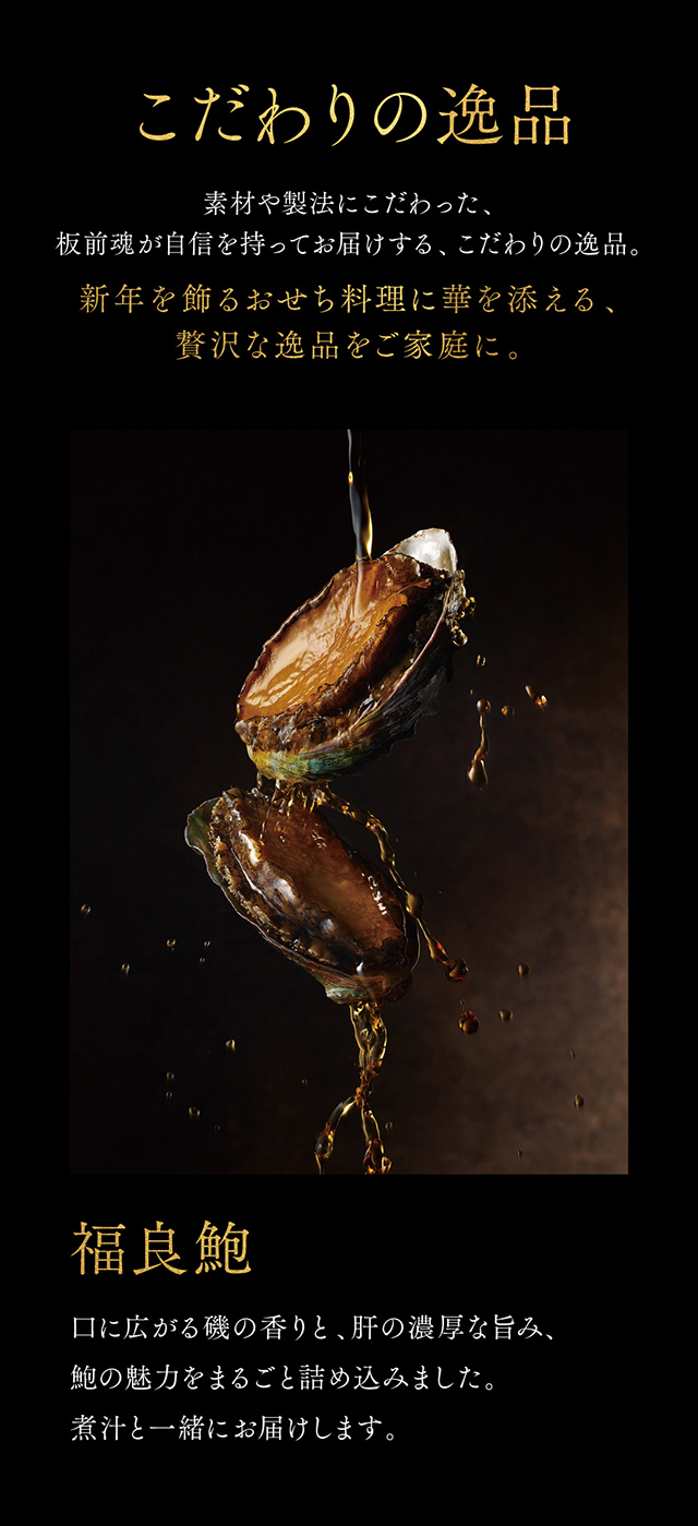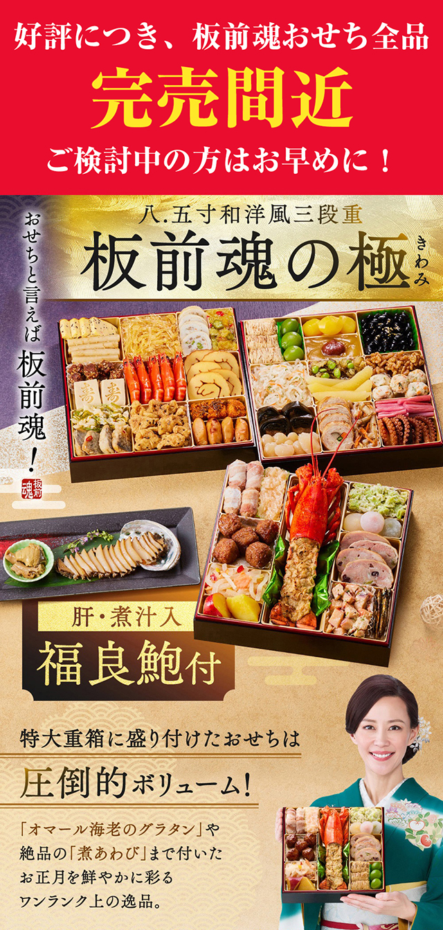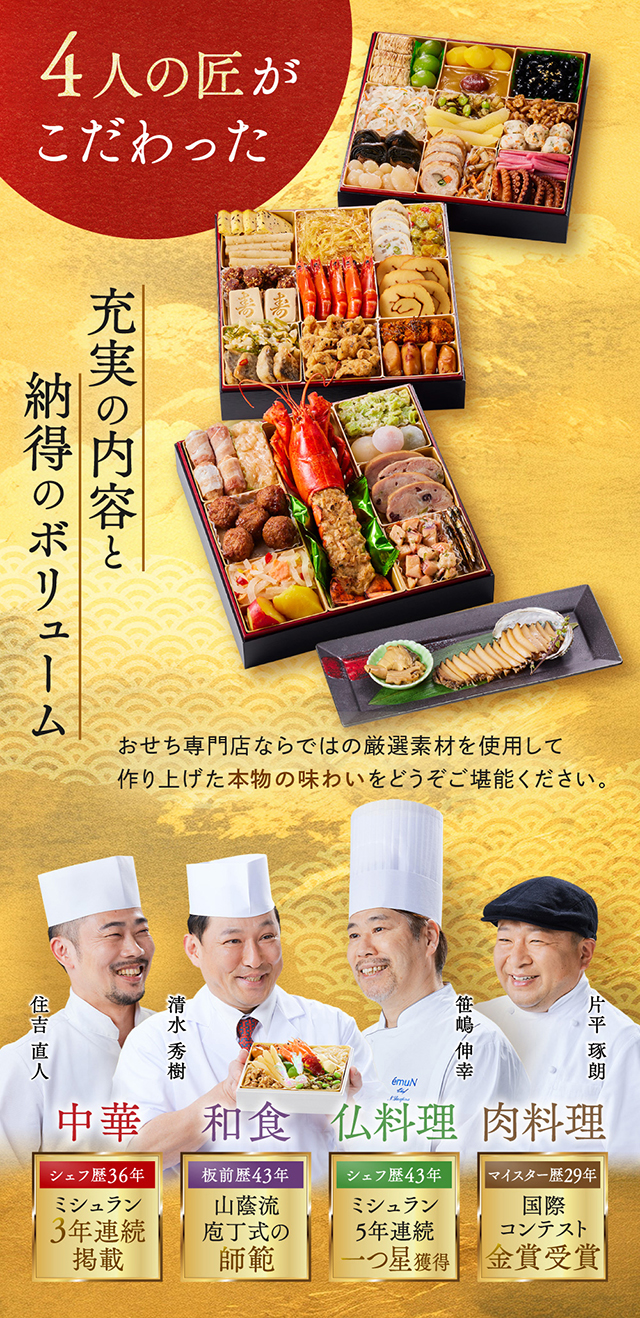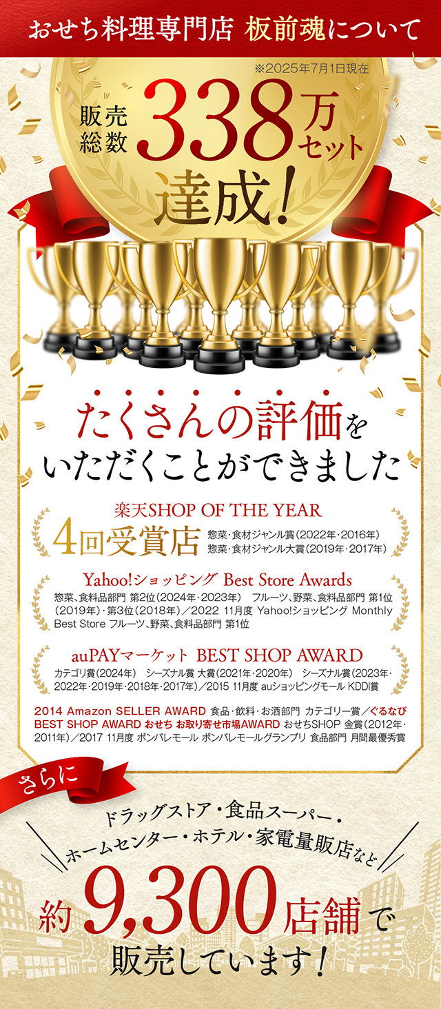 板前魂のおせち料理は、函館、小樽 、仙台、 築地 、山梨、金沢、浜松、 京都 、下関、 博多 、鹿児島など日本や海外の産地をまわり厳選した食材を使用し、有名店やホテルで修行したシェフや繁盛店を営む板長といった4人の匠が監修しています。