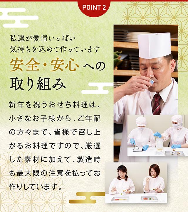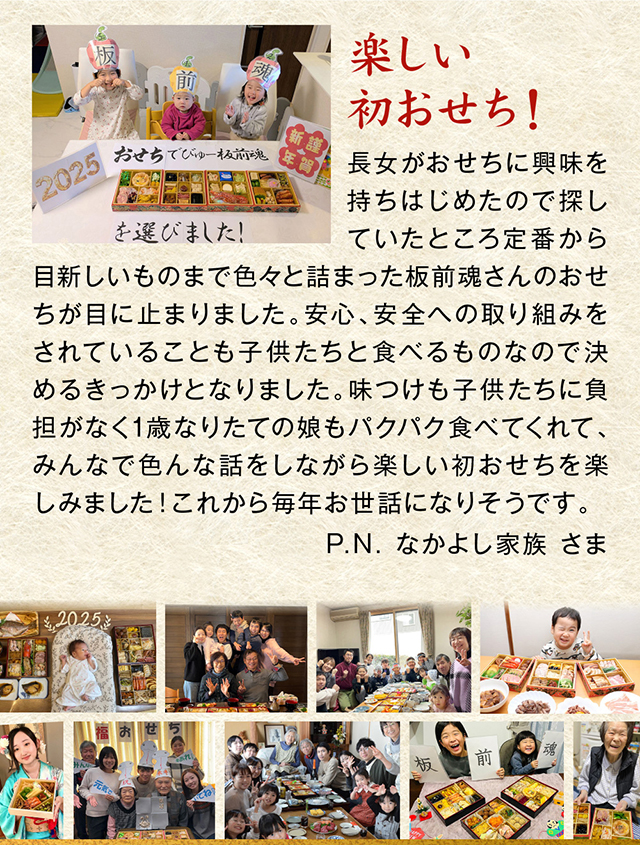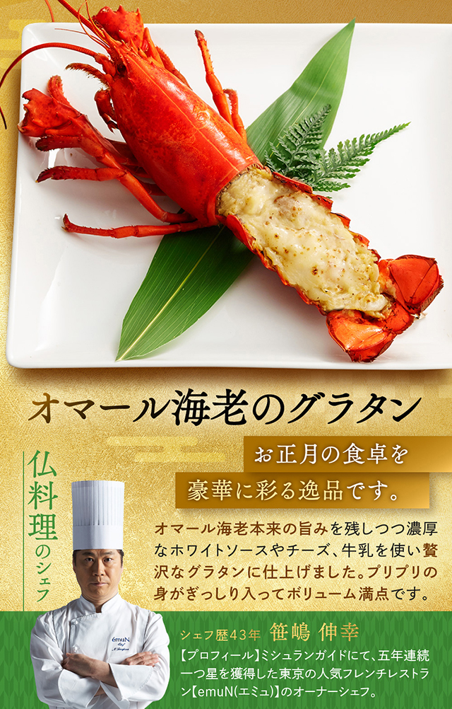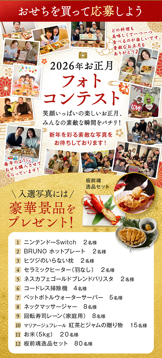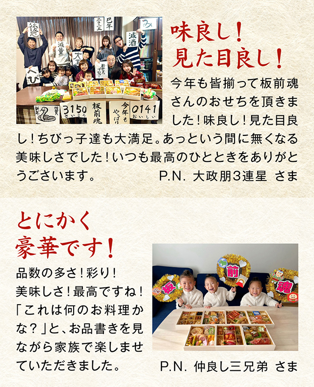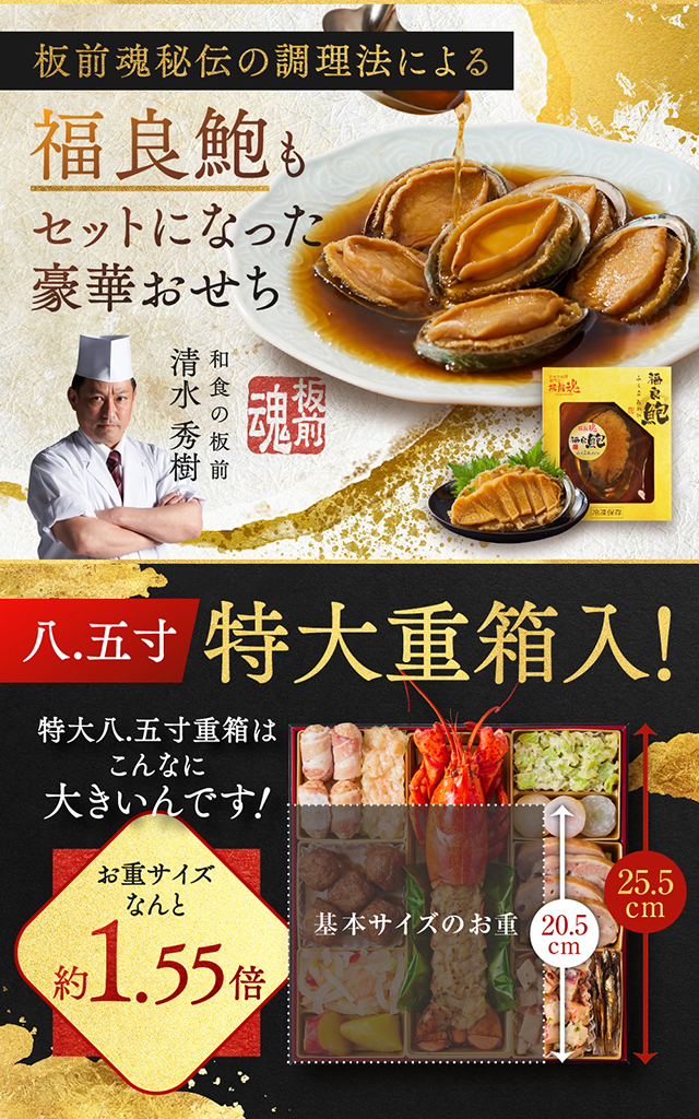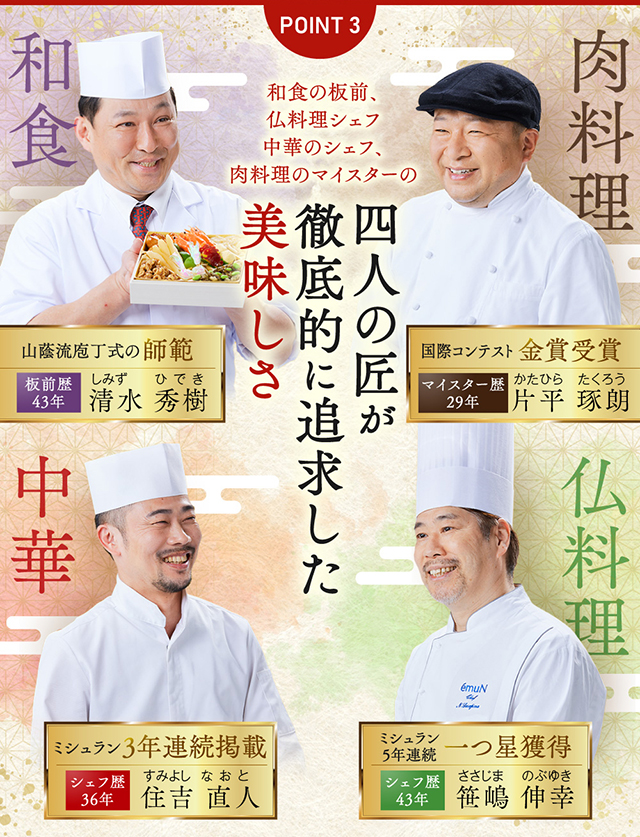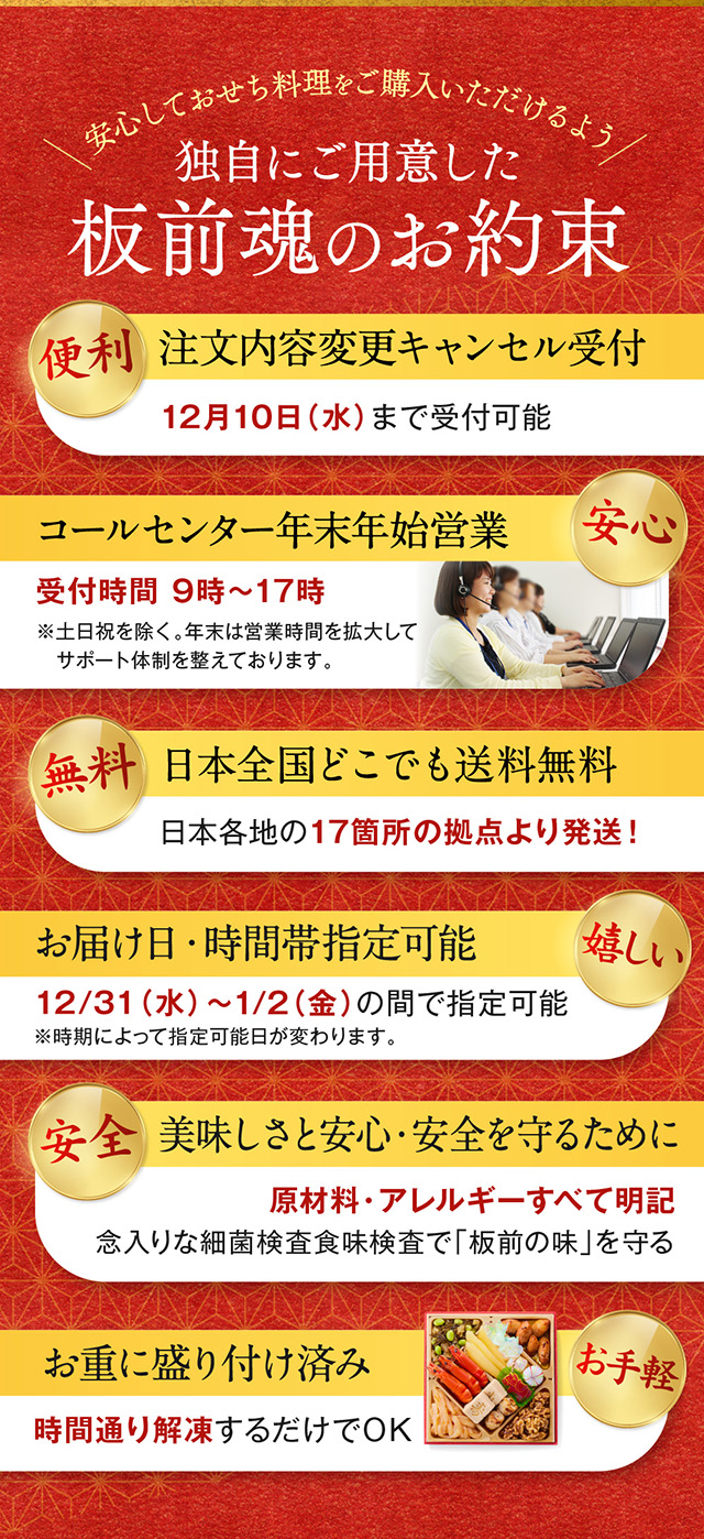 板前魂のおせち料理は、函館、小樽 、仙台、 築地 、山梨、金沢、浜松、 京都 、下関、 博多 、鹿児島など日本や海外の産地をまわり厳選した食材を使用し、有名店やホテルで修行したシェフや繁盛店を営む板長といった4人の匠が監修しています。