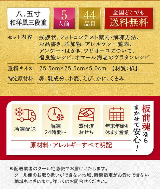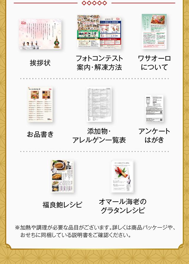 (お品書き、添加物・アレルゲン一覧表、解凍方法、祝箸5膳付き)