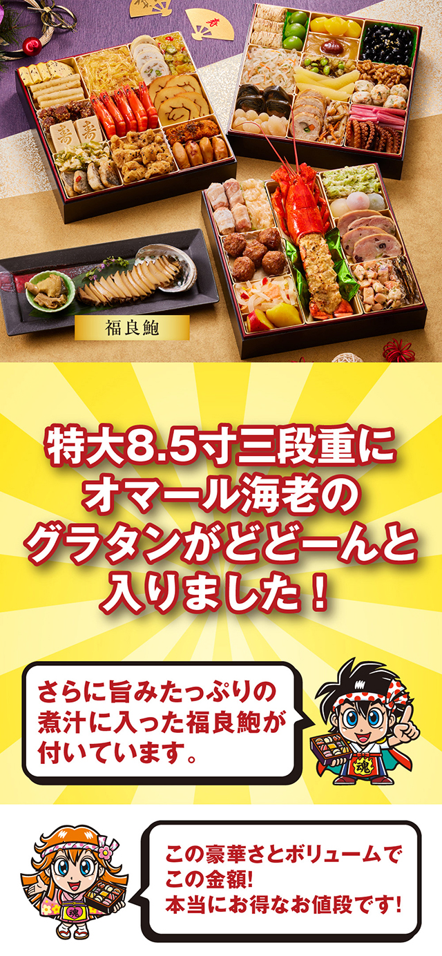【本日限定!ポイント5倍+最大2,000円OFFクーポン】おせち 完売間近 予約 おせち料理 板前魂の極 特大8.5寸和洋風三段重 福良鮑 鮑 あわび オマール海老のグラタン 付き 和風 洋風 特大重おせち 5人前 44品目 人気 正月 冷凍 2025 2026 送料無料
