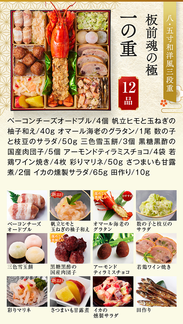 【一の重】ベーコンチーズオードブル/帆立ヒモと玉ねぎの柚子和え/オマール海老のグラタン/数の子と枝豆のサラダ/三色雪玉餅/黒糖黒酢の国産肉団子/アーモンドティラミスチョコ/若鶏ワイン焼き/彩りマリネ/さつまいも甘露煮/イカの燻製サラダ/田作り