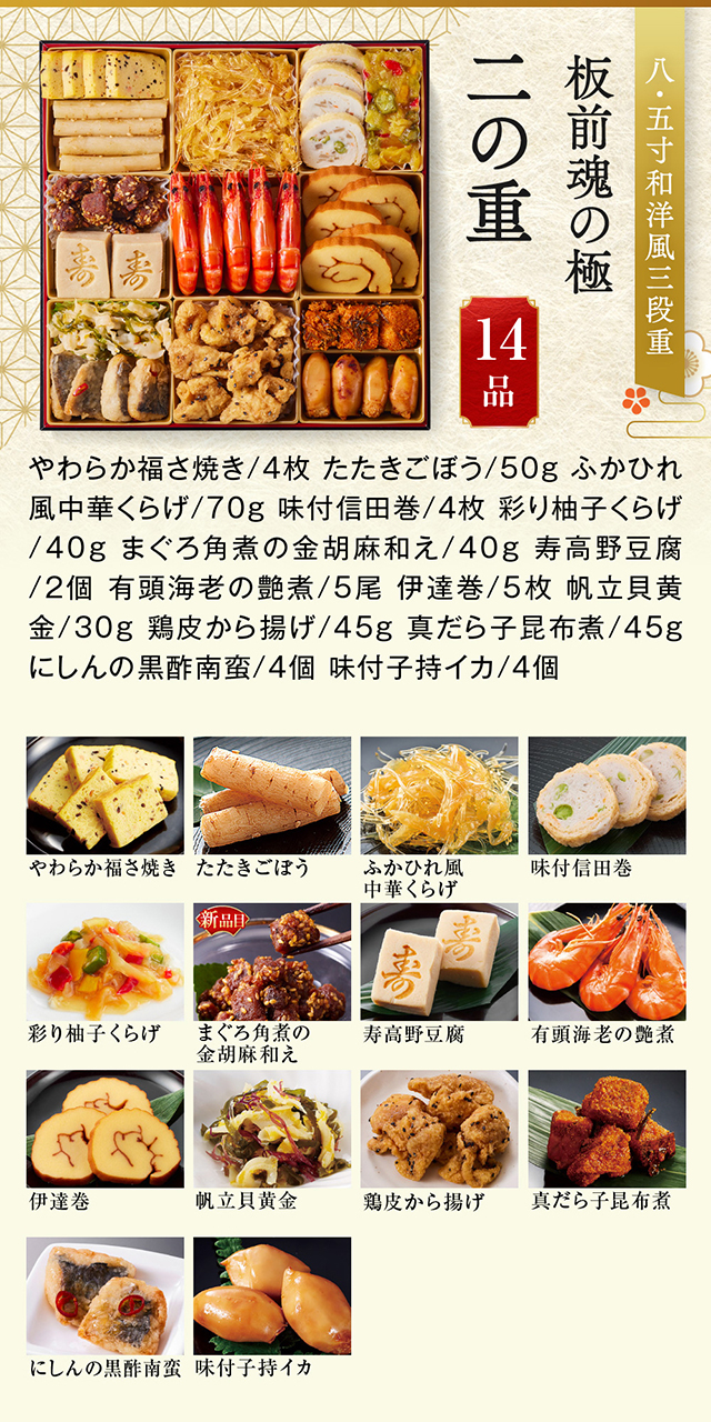 【二の重】やわらか福さ焼き/たたきごぼう/ふかひれ風中華くらげ/味付信田巻/彩り柚子くらげ/まぐろ角煮の金胡麻和え/寿高野豆腐/有頭海老の艶煮/伊達巻/帆立貝黄金/鶏皮から揚げ/真だら子昆布煮/にしんの黒酢南蛮/味付子持イカ