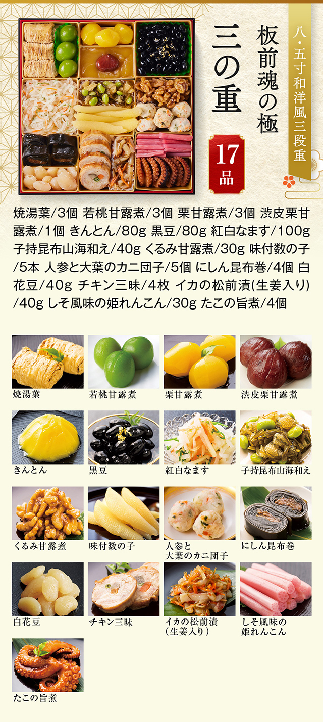 【三の重】焼湯葉/若桃甘露煮/栗甘露煮/渋皮栗甘露煮/きんとん/黒豆/紅白なます/子持昆布山海和え/くるみ甘露煮/味付数の子/人参と大葉のカニ団子/にしん昆布巻/白花豆/チキン三昧/イカの松前漬(生姜入り)/しそ風味の姫れんこん/たこの旨煮