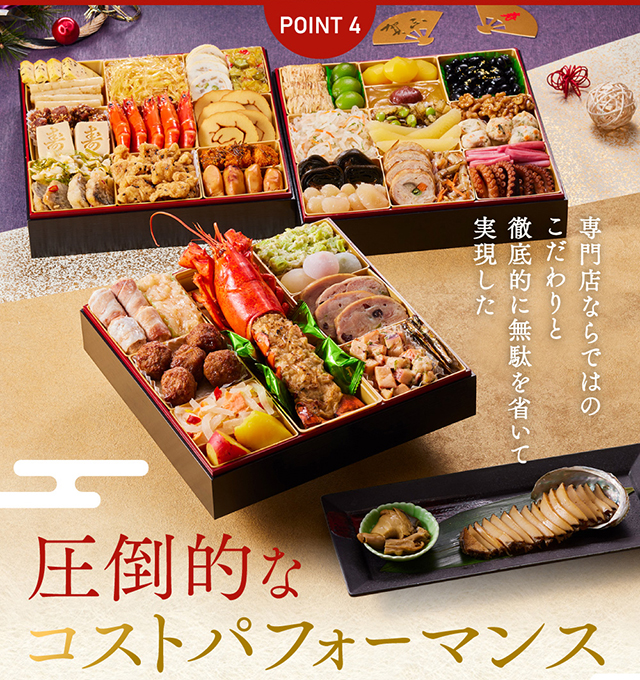 - 美味しかったので、去年と同じ物を注文しました。特にあわびの煮物は美味しく頂きました。