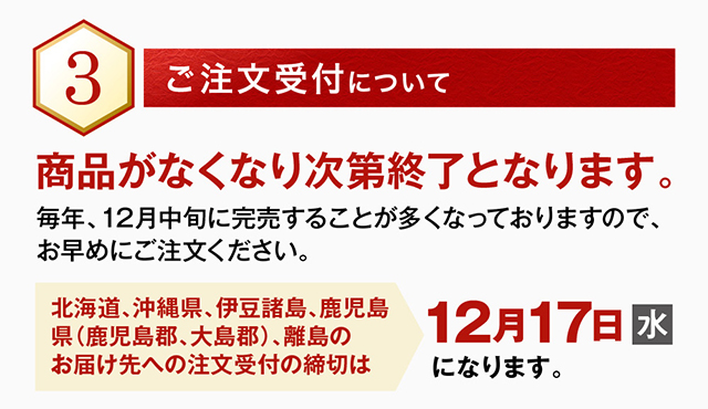 北海道、沖縄県、伊豆諸島、鹿児島県(鹿児島郡、大島郡)、離島のお届け先への注文受付の締切は12月17日(水)になります。