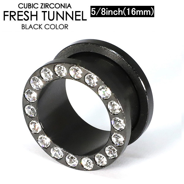 メール便 送料無料 フレッシュトンネル ブラック ラインストーン付 5/8inch(16mm) サージカルステンレス316L BLACK カラーコーティング加工 ボディーピアス ゴージャス イヤーロブ 16ミリ ┃