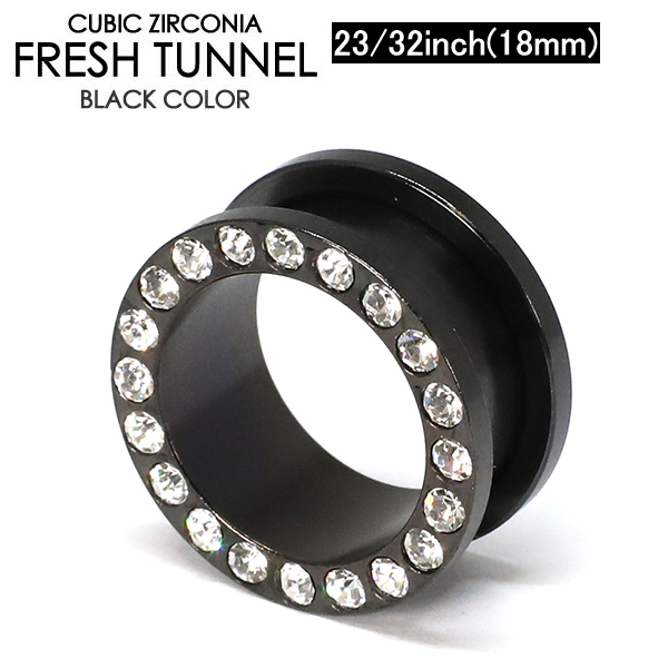 メール便 送料無料 フレッシュトンネル ブラック ラインストーン付 23/32inch(18mm) サージカルステンレス316L BLACK カラーコーティング加工 ボディーピアス ゴージャス イヤーロブ 18ミリ┃