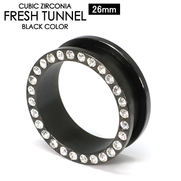 メール便 送料無料 フレッシュトンネル ブラック ラインストーン付 26mm サージカルステンレス316L BLACK カラーコーティング加工 ボディーピアス ゴージャス イヤーロブ 26ミリ ┃