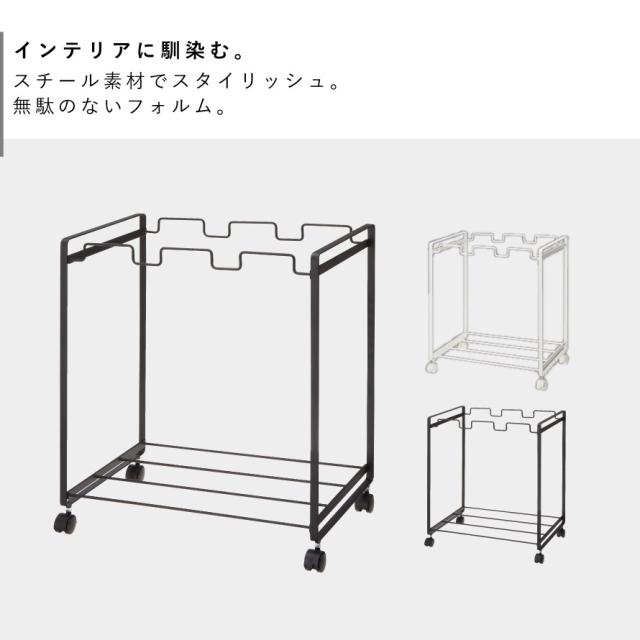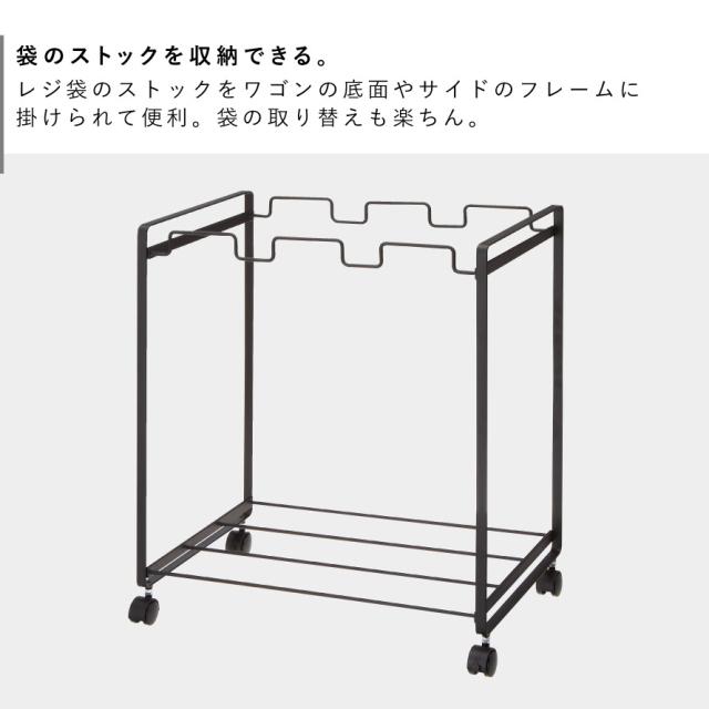 レジ袋のストックをワゴンの底面やサイドのフレームに掛けられて便利。袋の取り替えも楽ちんです。