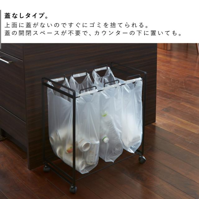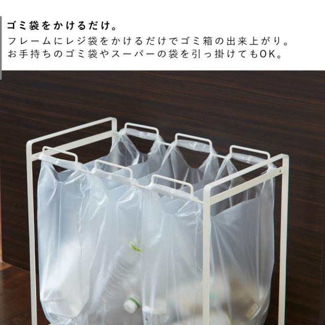 レジ袋の持ち手を掛けるだけで分別自在。便利な3分別タイプです。フレームにレジ袋をかけるだけでゴミ箱の出来上がり。
