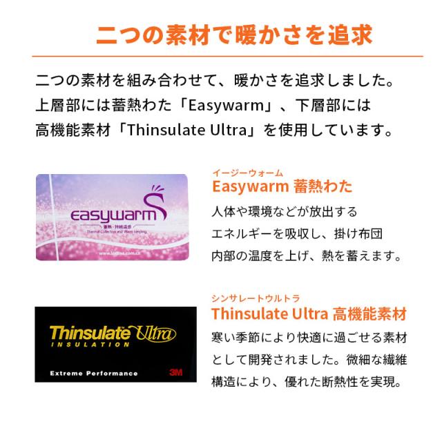 | ・獣毛を使わない、あたたかな掛け布団。 羽毛アレルギーの方や獣毛の独特の臭いが苦手な方、 気軽に扱えるあたたかいお布団をお求めの方。そんな あなたにおすすめなのが、軽くて暖かく、お手入れも しやすいシンサレートの掛け布団です。 ・お家で洗えていつでも清潔羽毛布団とは違い、洗濯機で洗えるのが嬉しいポイント。 小まめに洗って清潔に保ちたい方におすすめです。 ・二つの素材で暖かさを追求二つの素材を組み合わせて、暖かさを追求しました。 上層部には蓄熱わた「Easywarm」、下層部には 高機能素材「Thinsulate Ultra」を使用しています。 | |