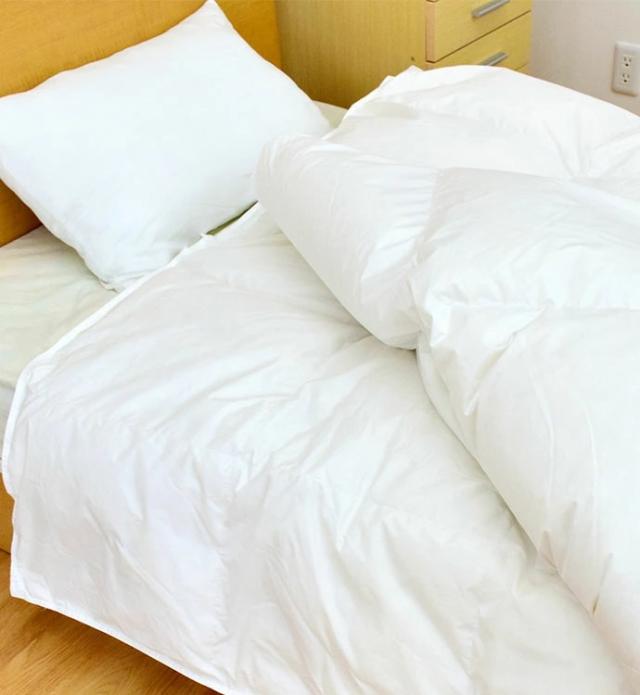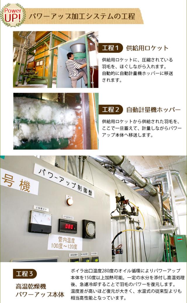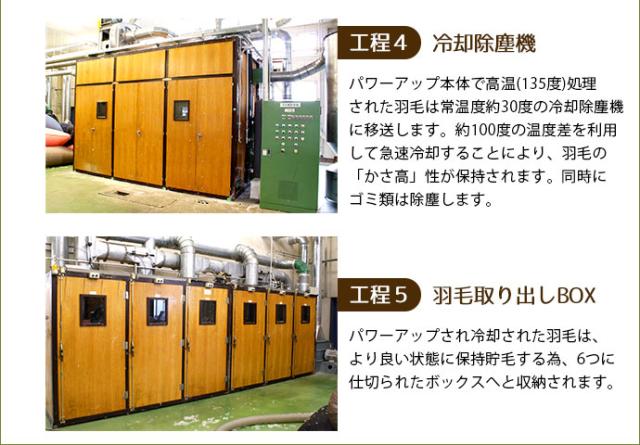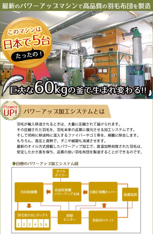 この羽毛は洗浄し、精製された輸入羽毛を日本国内でゴミや夾雑物を徹底的に取り除き、特殊スチーム加工で更にかさ高を上げていますので元々の羽毛よりもグレードアップしています。 |