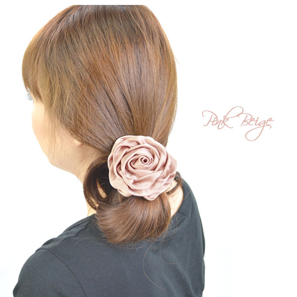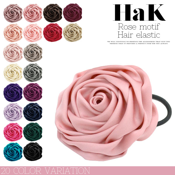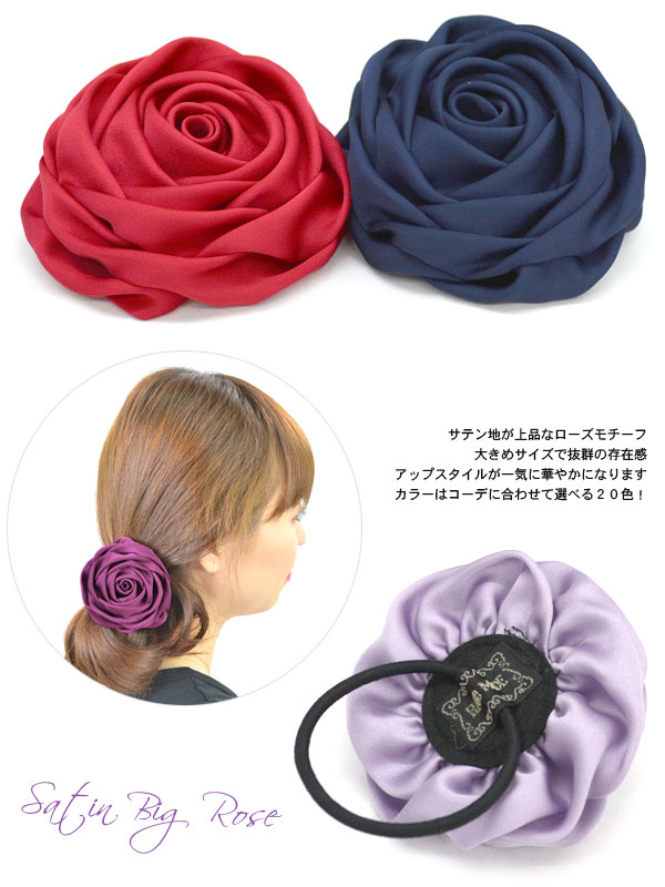 ヘアゴム ヘアポニー ローズモチーフ サテン地 バラ 薔薇 レディースアクセサリー フラワーモチーフ 立体 3D 大きめ BIGサイズ シュシュ 髪留め 髪飾り ハレの日 オケージョン 光沢 韓国 送料無料 (hak407)