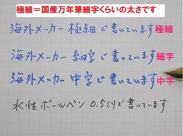 国産万年筆より1段階太め…ペリカン・極細=国産パイロットの細字とほぼ同じ太さです。