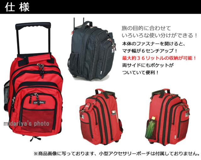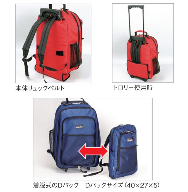 | 旅の目的に合わせていろいろな使い分けができる! 手提げ、リュック、キャリーの3WAY仕様で旅行はもちろん出張などにもオススメです。 着脱できる小型デイパック付き♪ マチWで必要に応じてマチ幅が最大6センチアップ!最大36リットルの収納が可能! 本体のファスナーは両開きで大きく開きます。 リュックベルトは収納式 汚れ止めカバー付キャスター ■サイズ:横幅34×高さ50×厚み19cm(25cm) ■最大寸法:34×56×30cm ■着脱式のDパックサイズ:横27×高さ40×厚み5cm ■素材:ポリ600D裏PVCコーティング ■重量:約1950g ■容量:約27リットル、最大約36リットル ■カラー:[01]ブラック、[03]ネイビー、[09]レッド ■生産国:中国(企画:日本) ■仕様 [正面ポケット]アウトポケット、ネットポケット [サイドポケット]アウトポケット、ネットポケット [背面]パッド入りリュックベルト [サブデイパック]着脱式 <注意事項> ※予告なく仕様変更する事がありますのでご了承下さい。 ※小型ポーチが付いている写真がありますが、実際は付属されておりません。 |