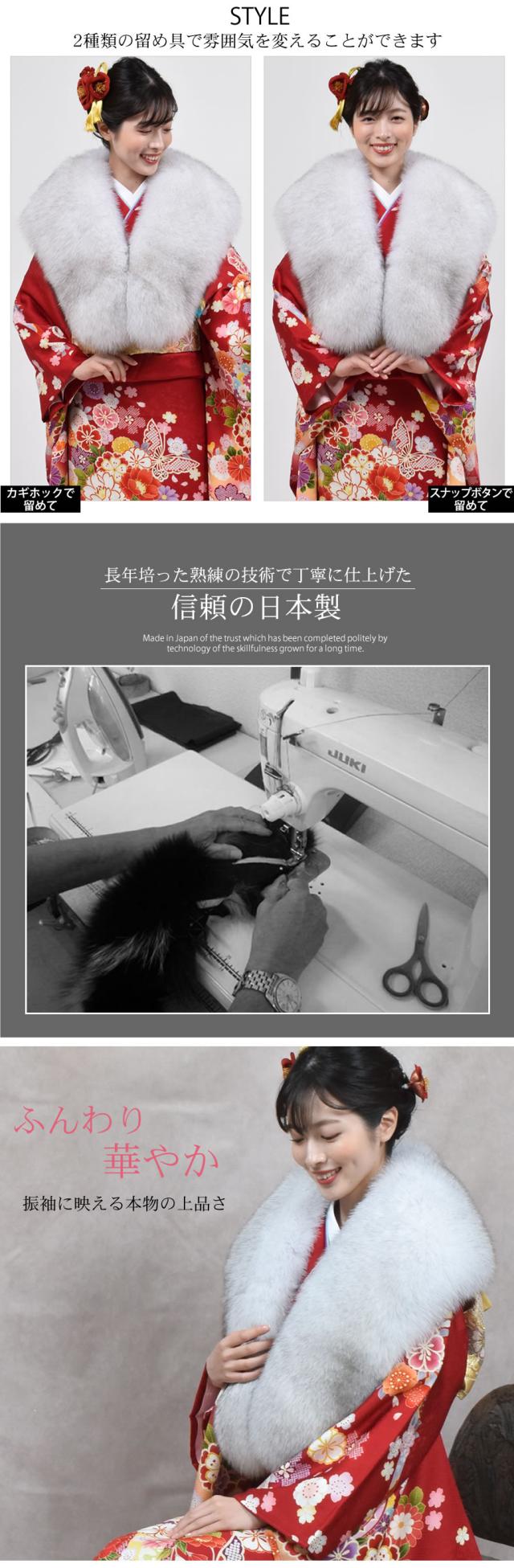 緻密な綿毛とふわりとした刺毛が美しいSAGAのブルーフォックス。天然の美しい光沢が放つ気品は、晴れの日の装いを華やかに彩ります。成人式のお着物にはもちろん、その他の和装にもフォーマルな装いにも幅広くお使いいただけるアイテムです。密度が高く、高級感溢れるファーは、さすがの「SAGA FOX」。2種類の留め具で装いや場面に合わせて雰囲気を変えることができます。丁寧な縫製の日本製で安心のファーストールです。