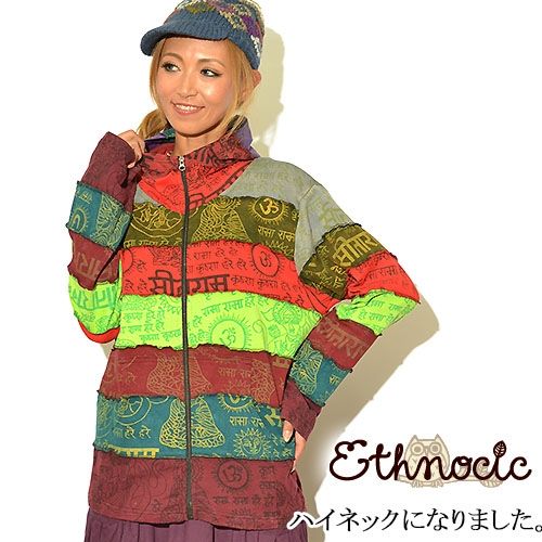 パーカー レディース【ネパール製】レインボー切替 エスニックテイスト風 フード付ジップアップパーカー! 「送料無料」