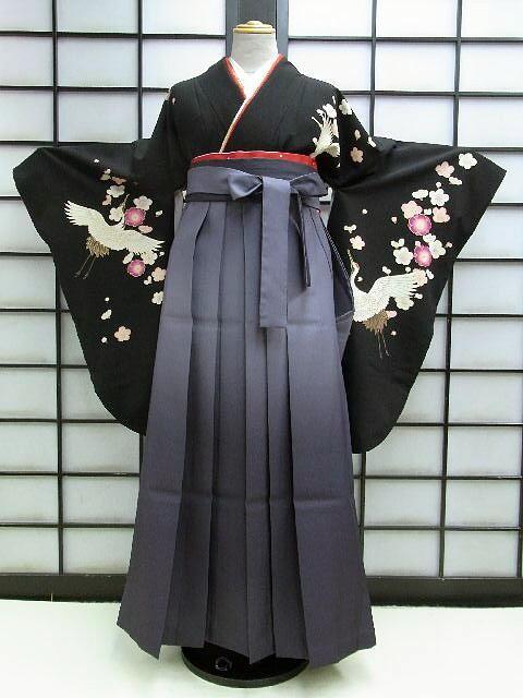 着物色:黒地に鶴と梅柄 袴色:紺地のボカシ柄