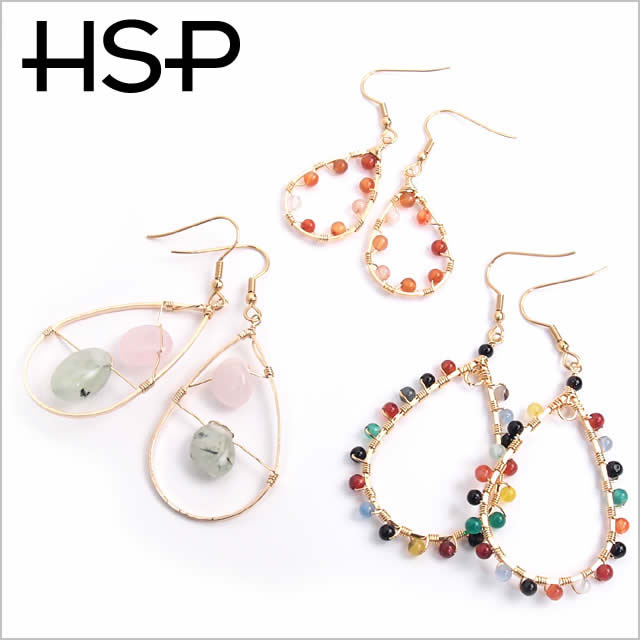 女性に人気のティアドロップ型のフレームに天然石をセットしたピアス。
