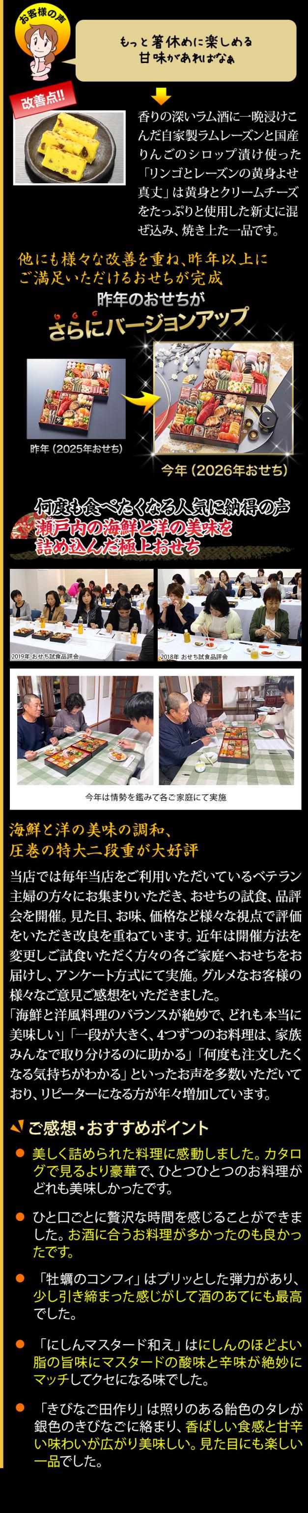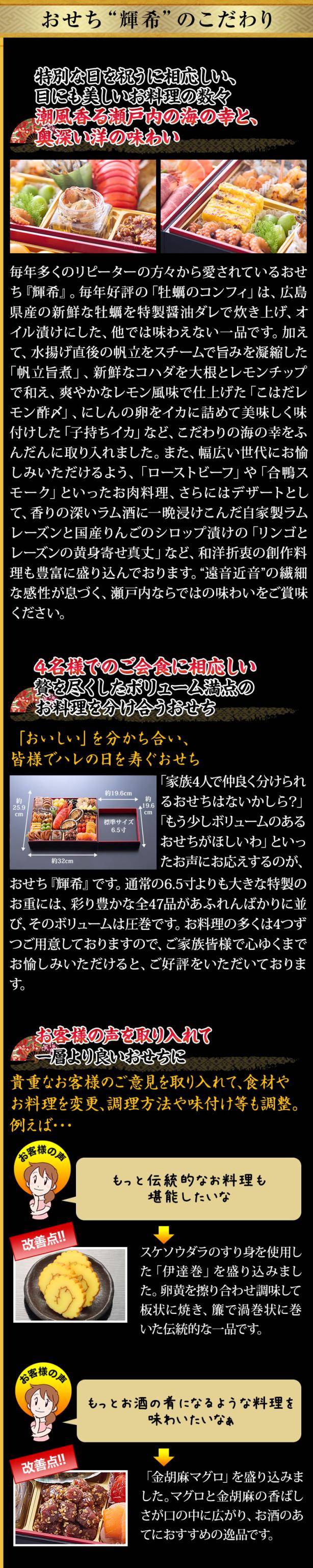 令和8年の『輝希』は、瀬戸内が生み出した厳選された美味を存分にお愉しみいただけるように、豪華食材として鮑、牡蠣、ロブスター、帆立、いくらが織りなす海の恵みに加え、ローストビーフやカニの紅白テリーヌといった洋風の料理も惜しみなく盛り込みました。ほかにも数の子や黒豆といった伝統の味に、今年は「伊達巻」を追加し、よりお正月らしいおせちに仕上がっております。さらに多くの料理を4つずつ用意し、ご家族皆様で和と洋のハーモニーを味わいながら、賑やかな 新年をお迎えいただけるおせちに仕上がったと自負しております。