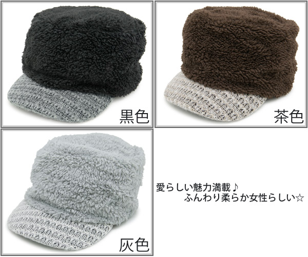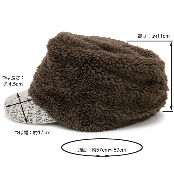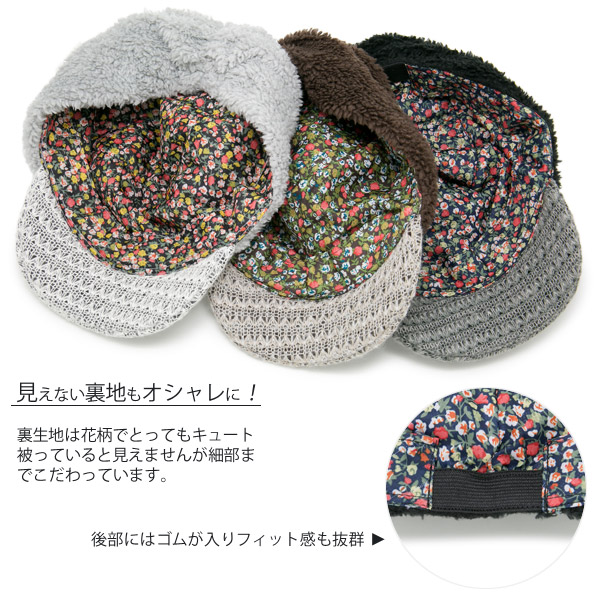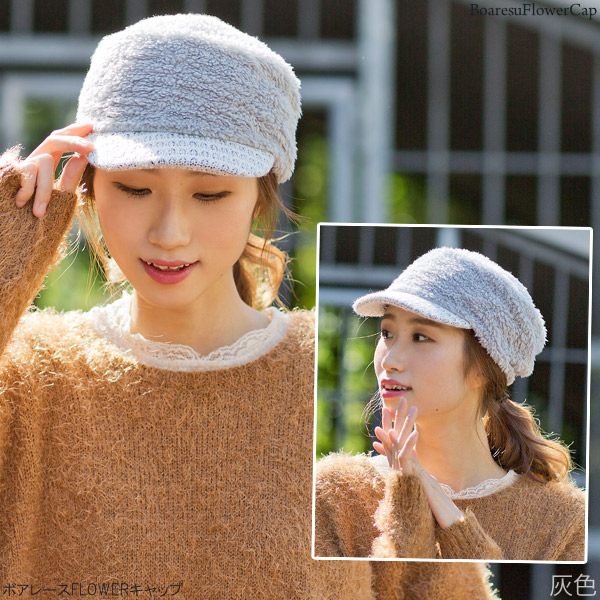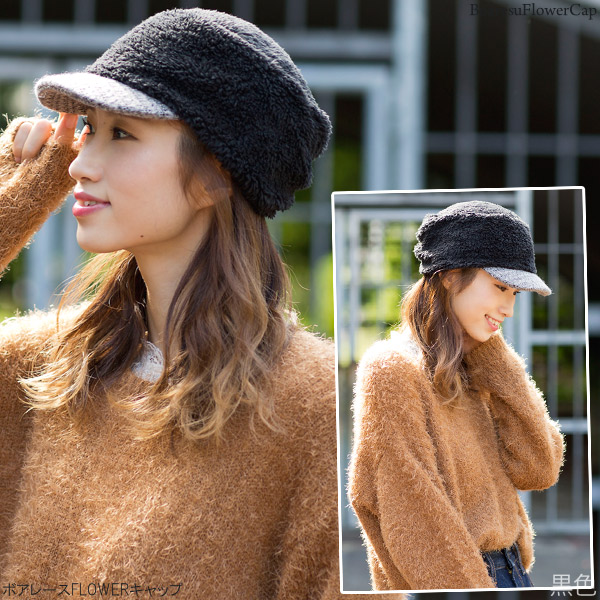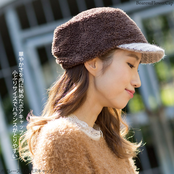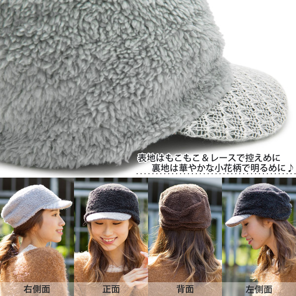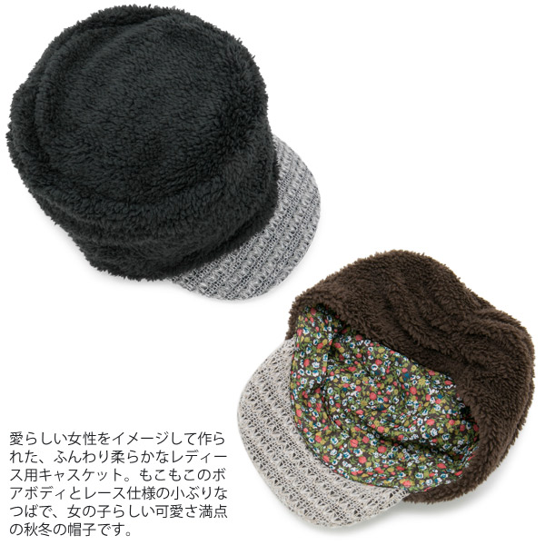 愛らしい女性をイメージして作られた、ふんわり柔らかなレディース用キャスケットのご紹介です。もこもこのボアボディとレース仕様の小ぶりなつばで、女の子らしい可愛さ満点の秋冬の帽子。裏生地は花柄でとってもキュート被っていると見えませんが細部までこだわっています。後部にはゴムが入りフィット感も抜群☆余分なボリュームを抑えた小ぶりサイズがちょうどいいバランスですね。