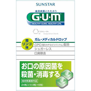 「GUM(ガム) メディカルドロップC 青リンゴ味 24粒」は、お口の原因菌を殺菌、消毒するドロップタイプの口臭清涼剤です。歯磨きができない食間などに、お口やのどに潜む歯周病菌等の細菌を殺菌、消毒します。おだやかな甘さの青リンゴ味。シュガーレスです。