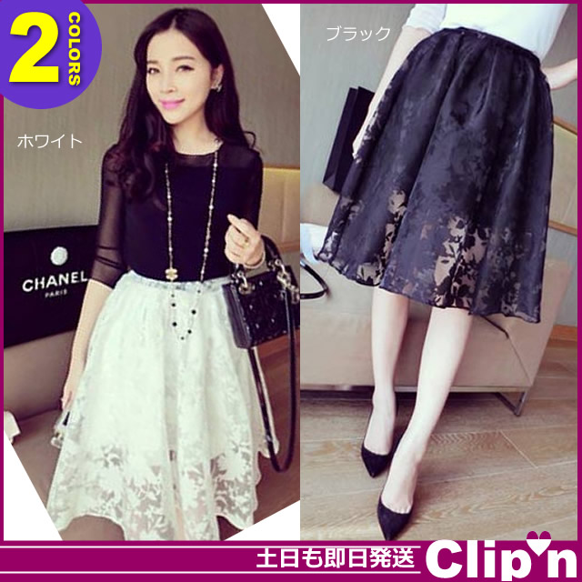 【即日発送】<再入荷>チュール レース 透し模様入り ミモレ丈 フレア スカート 裏付*ボトムス□6000円以上送料無料[即納あす着]