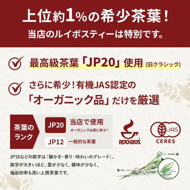 原材料名(原産国):有機ルイボス 発酵 JP20(南アフリカ)