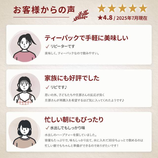 ルイボスティー独特の丸みと甘いのど越しが特長です。
