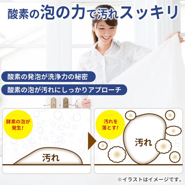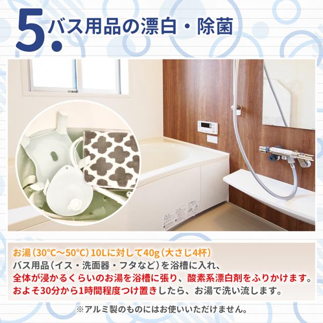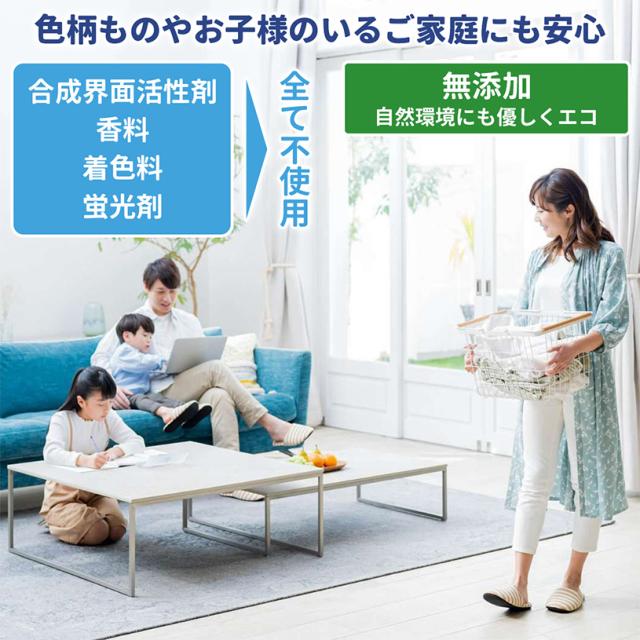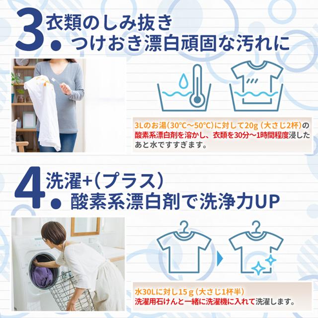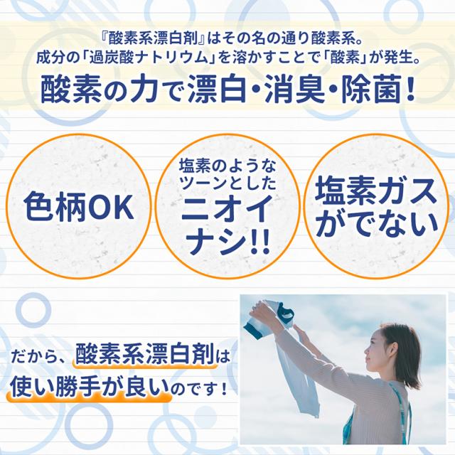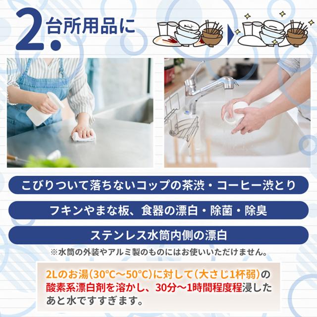絹・毛以外のすべての繊維や色柄物、樹脂加工したものに使用でき、除菌・除臭・漂白効果があります。粉石けんや液体石けんの助剤としても使用できます。