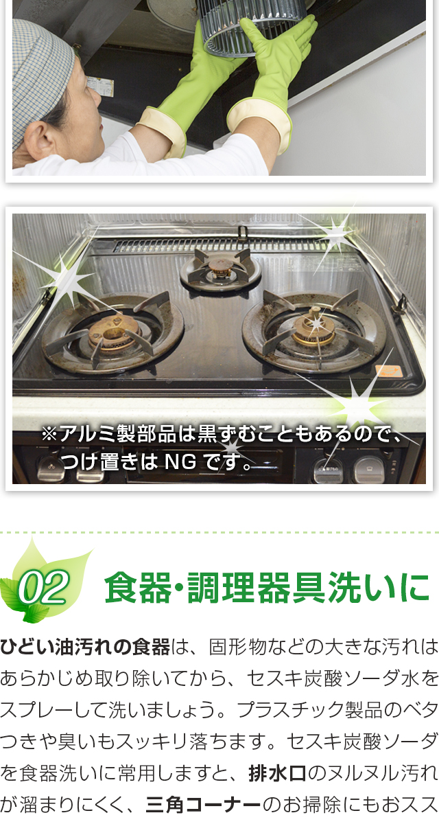 セスキ炭酸ソーダは、重曹と炭酸ナトリウム(炭酸塩)の中間的な性質を持ち、重曹よりも強いアルカリ性を示します。そのため、油汚れや皮脂汚れをより効果的に落とすことができます。血液の汚れ、エリ・そで・靴下などの汗の臭いや皮脂汚れ、台所周りの油汚れに。