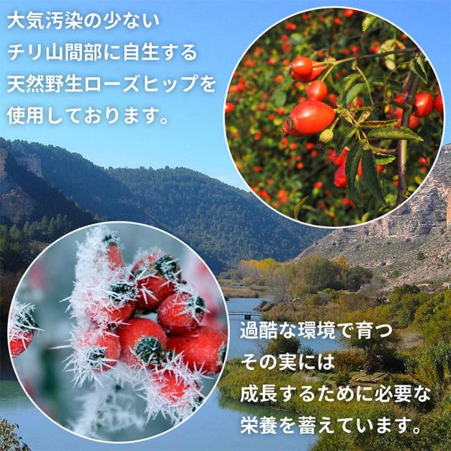 大気汚染の少ないチリ山間部に自生する天然野生のバラの果実から採取されたローズヒップの果実を100%使用し、栄養豊富な粉末にしました。過酷な環境で育つその実には、成長するために必要な栄養が豊富に含まれています。