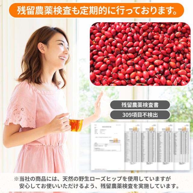 国内検査機関にて307項目不検出 ※当社の商品には、天然の野生ローズヒップを使用していますが、安心してお使いいただけるよう、残留農薬検査を実施しています。 |