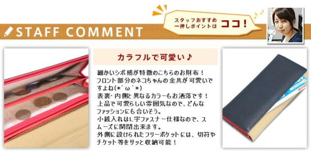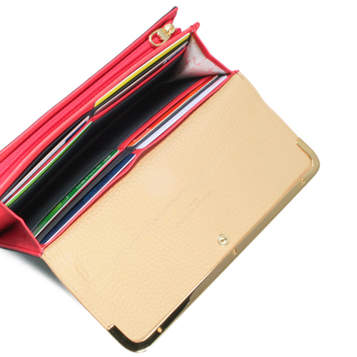 | 配色が特徴のこちらのお財布! フロント部分のネコちゃんの金具がさりげなく可愛らしい♪ 小銭入れはL字ファスナー仕様で、開閉がスムーズ。 仕切り付きで、仕分けがしやすいのも嬉しいポイント。 外側には、切符やチケット等の収納に便利なフリーポケットを装備! 12箇所のカードポケットと、2箇所のフリーポケットで、カードを多く持ちたい方にも安心の収納力を発揮します! |