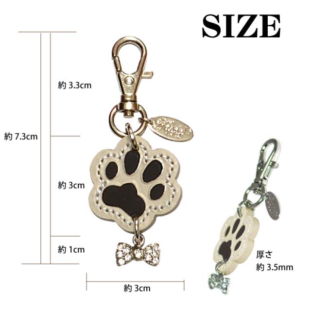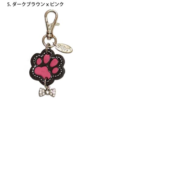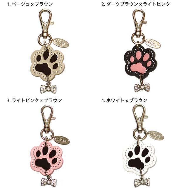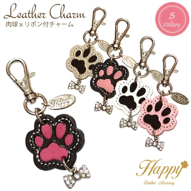 【メール便対応】肉球&リボンチャーム 牛本革 スワロフスキー付き Happy 全5色 HC-12【キーホルダー チャーム リード 首輪チャーム キーリング 猫 犬 日本製 ハッピー】┃