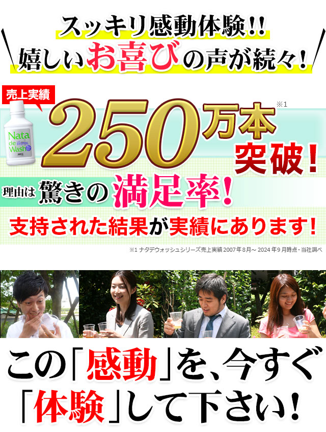 「ナタデウォッシュ」は低刺激タイプだから、よくある「ピリピリ感」や「渋み」がほぼ無く、今まで刺激が気になってマウスウォッシュを苦手とされていた方や、小さなお子様やご年配の方など、ご家族皆さんで、誰にでもお使い頂けます。