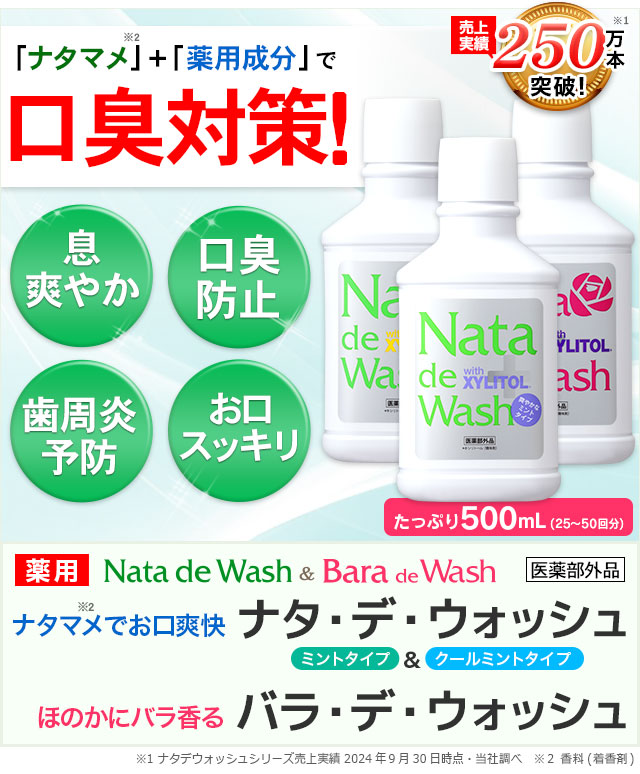 「ナタデウォッシュ」は、抗炎症作用のある「グリチルリチン酸2K」を配合していますので、毎日お使い頂く事で、口臭の原因となる歯周炎や歯槽膿漏を予防し、口内環境を整えます。